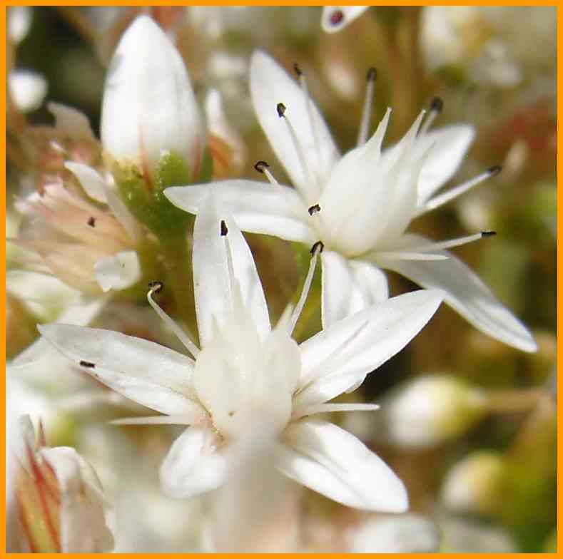 5 Kronblätter, doppelt so viele Staubblätter, mit rotem Mittelnerv.
