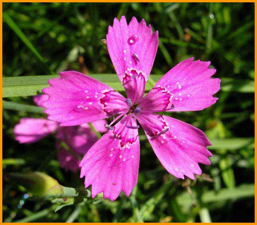 Krone mit weißen Punkten. Kronblätter an der Spitze gezähnelt.