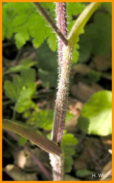 Stängel unten rotfleckig, bis oben borstig behaart.