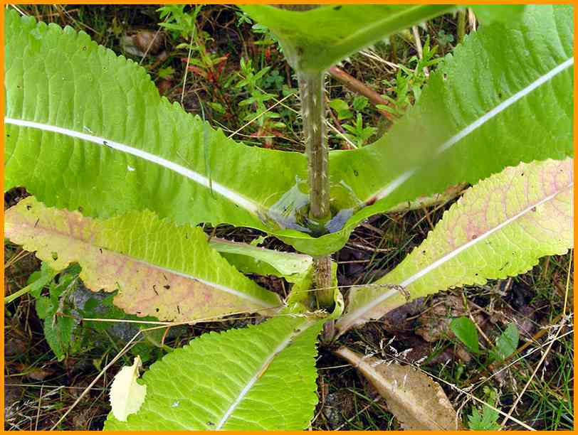 Stängel stachelig. Blätter am Grund verwachsen.