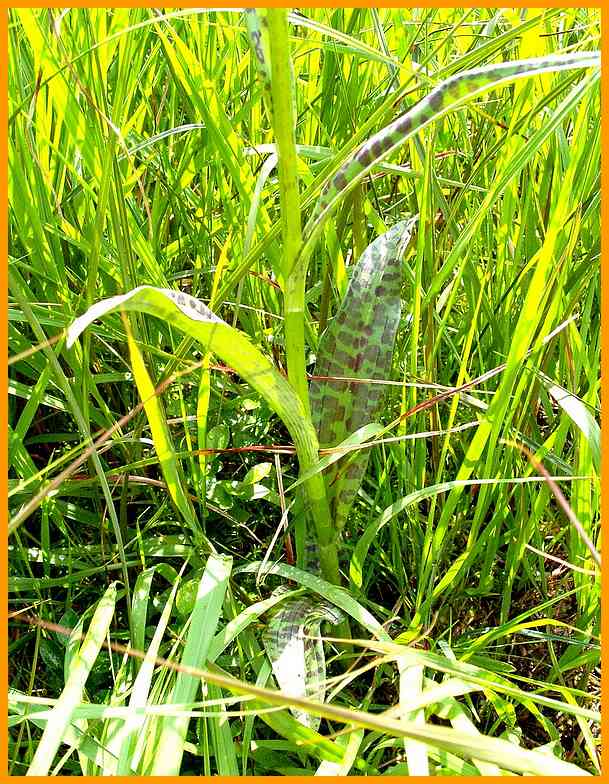 Blätter nineal, spitz mit kreisrunden Flecken.