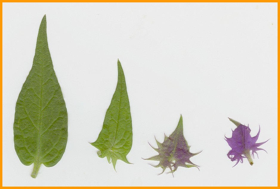 Deckblätter (rechts) spießförmig, blauviolett, borstig gezähnt.